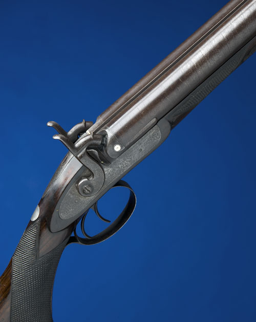 circa 1846-49, with 30 1/4in. shortened twist sighted barrels with feint signature 'JOSEPH KEMP. 31 DUKE ST. GLOUCESTER SQUARE, LONDON' on the rib, border and scroll engraved patent breeches each with pierced platinum plug and inlaid with a single gold-line on the rib, border and scroll engraved tang and locks, the latter each signed 'JOSEPH KEMP' (both hammers working replacements), figured walnut pistolgrip half-stock (some scattered bruising, small chip to left edge of fore-end) with chequered grip and fore-end, engraved iron mounts (engraving worn), silver escutcheon, and iron-tipped ramrod with worm (iron parts with some surface corrosion marking and discolouration throughout), London proof marks.