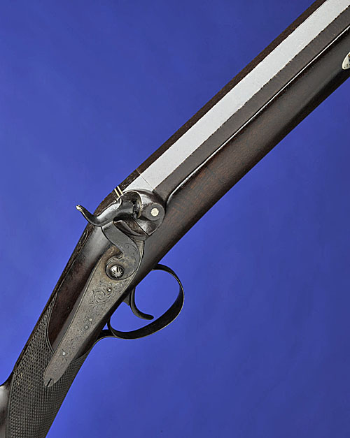 mid-19th century, with 48in. two-stage fine stub twist sighted barrel, scroll engraved breech with platinum plug and inlaid with two platinum lines, border and scroll engraved tang and back-action lock (hammer a working replacement), the latter signed 'WALTON & CO.', walnut half-stock with chequered grip (cracked opposite the lock), border and scroll engraved reblued iron mounts (engraving worn), white metal barrel-bolt escutcheons, dark horn fore-end cap, and associated brass-tipped ramrod (barrel discoloured, engraving to lock worn), Birmingham proof marks.
