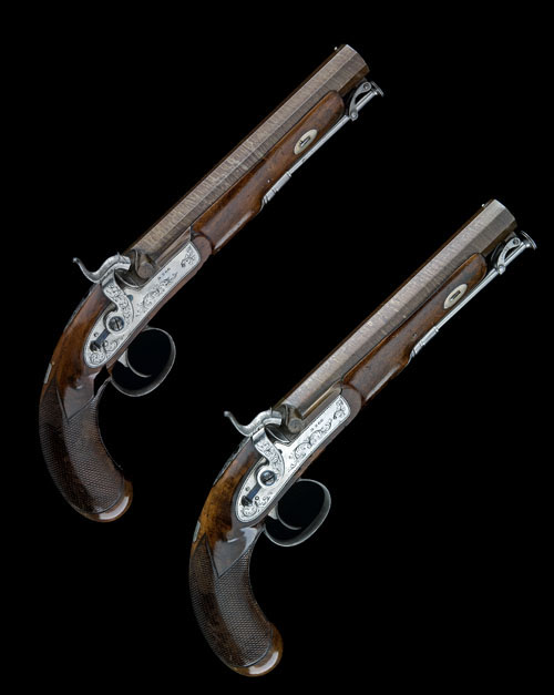 circa 1830-40, with 7 3/4in. rebrowned twist octagonal barrels each signed 'D. EGG. LONDON' towards the breech, border and scroll engraved breeches, tangs and bolted locks, the tangs each incorporating the rear-sight, the locks each signed 'D. EGG', walnut three-quarter stocks each with chequered butt, scroll engraved iron mounts, border and scroll engraved iron belt hooks (almost certainly added during their working life), silver escutcheons each engraved with a crest and initials, silver barrel-bolt escutcheons, and iron stirrup ramrods (iron parts polished bright, safety-bolts and screw-heads reblued), London proof marks.