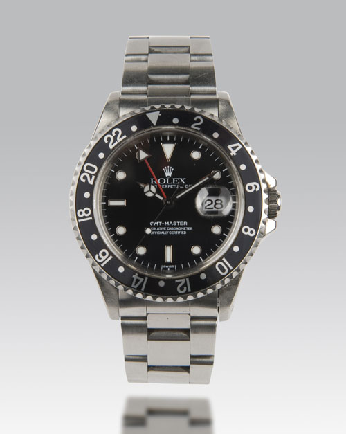 ROLEX A STAINLESS STEEL AUTOMATIC TWO TIME ZONE WRISTWATCH WITH BRACELET, CENTER SECONDS , SIGNED ROLEX GMT-MASTER, DATE AND BLACK D...