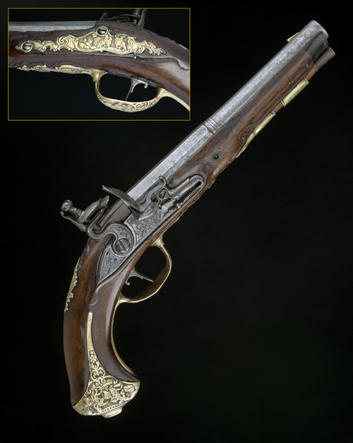 second quarter of the 18th century, with 8in. slightly swamped two-stage barrel with brass fore-sight, turned girdle and octagonal breech-section, engraved tang retaining traces of blued finish, flat bevelled lock signed 'T. POLTZ' and engraved with two martial trophies, one on the tail, the other beneath the pan, moulded figured walnut full stock carved in low relief with foliage behind the barrel tang (old repaired crack to the right side of the fore-end), flattened butt, cast and chased brass mounts including spurred pommel, trigger-guard and side-plate each decorated with scenes of horsemen engaged in combat surrounded by scrollwork, brass trophy of arms escutcheon, dark horn fore-end cap, and original horn-tipped ramrod with worm.