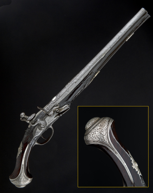 first half of the 18th century, with 13 1/2in. swamped barrel with three-quarter length sighting flat with rectangular panel heightened with silver and engraved with a 'signature', the breech-section with indistinct silver-lined maker's mark, single silver line and chiselled in low relief with scrollwork and flower-heads surrounding a domed applied silver escutcheon, border and scroll engraved silver-covered grooved tang with further 'signature', rounded lock engraved with scrollwork (some wear) and chiselled in low relief with a spray of foliage on the tail, moulded walnut full stock (forward half of fore-end replaced, some loss to edges of fore-end) carved in low relief around the barrel-tang and rear ramrod-pipe with scrollwork, silver mounts including spurred pommel finely chased with scrollwork and pierced side-plate, iron trigger-guard with pierced foliate finial and two silver-inlaid panels decorated with scrollwork and foliage, silver foliate escutcheon surmounted with a crown, and later horn-tipped ramrod (some discolouration to iron parts).