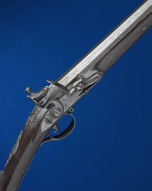 late 18th century, with 25in. two-stage octagonal to round swamped twist barrel signed 'NEWTON. GRANTHAM' towards the breech, silver fore-sight, gold-lined touch-hole, border and scroll engraved grooved tang, flat bevelled border engraved bolted lock (cock repaired) with stepped tail and signed 'NEWTON', figured walnut full stock carved in low relief with a shell behind the barrel-tang and with two-piece fore-end and skeletal butt (butt repaired), border and scroll engraved iron mounts including solid side-plate and trigger-guard with mounting block for a sling mount, shaped iron escutcheon, and iron-capped ramrod (iron parts with some surface corrosion and wear to engraving), Birmingham private proof mark, barrelsmith's mark of William Newton.