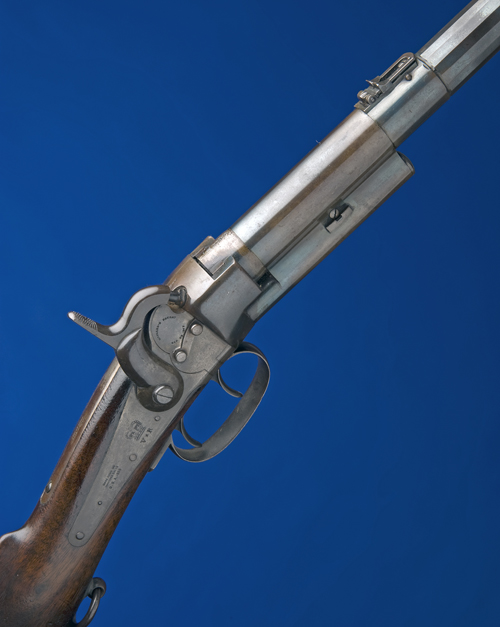 circa 1855-57, with 18in. two-stage blued sighted barrel, tang marked 'GREENE'S PATENT / JUNE 27. 1854', back-action lock with tape-primer marked 'MAYNARD'S PATENT / SEP. 22. 1845', the lock marked with 'VR' cypher and 'MASS. ARMS CO. / CHICOPEE FALLS / U.S.A. 1856', walnut butt, iron mounts including patch-box cover, and iron suspension ring (some light surface corrosion marking to mounts and barrel, barrel with older refinish), numerous War Dept. inspection marks, obsolete / sold out of service marks to breech.