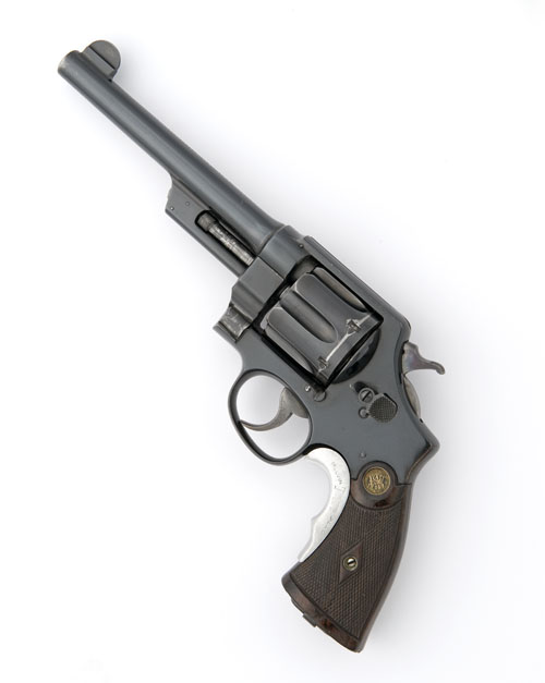 6 1/2in. blued sighted barrel (proved in 2009), blued cylinder and frame, the latter with 'S&W' monogram to the right side, case-hardened hammer and trigger, chequered walnut grips each with 'S&W' medallion, blued lanyard ring, and fitted with an aluminium Tyler's T-Grip (older reblue throughout), with Cooper Webb Jones & Co. brown leather flap holster dated '1918'.