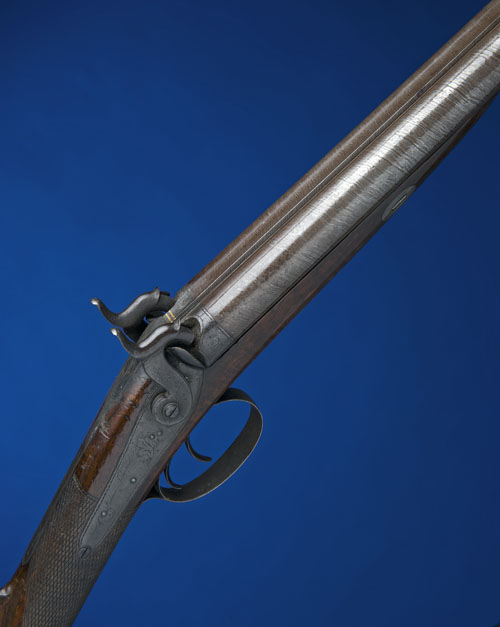 circa 1830, with 28 1/8in. stub twist sighted barrels, border and scroll engraved patent breeches inlaid with two gold lines on the rib between, border and scroll engraved long tang and back-action locks, the latter each signed 'HOLMES - LIVERPOOL', well figured walnut half-stock with chequered grip (some bruising, old crack running vertically along the grain on the left side of the butt), border and scroll engraved iron mounts, silver barrel-bolt escutcheons, and brass-mounted ramrod (some discolouration throughout), Birmingham proof marks, in associated lined and fitted case (interior worn, partitions loose) with some accessories including steel-mounted leather shot-flask, brass-mounted Dixon powder-flask (dented) retaining much original lacquered finish and wad-punch, the lid with shaped brass escutcheon incorporating the flush-fitting carrying handle (later applied corners, one locking catch incomplete).