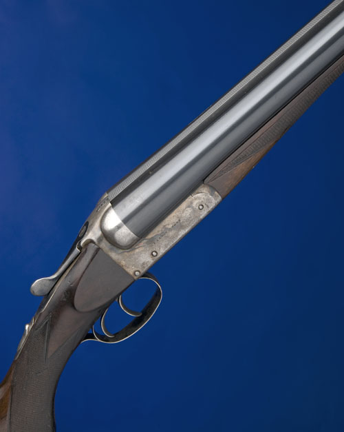 32in. nitro barrels with raised matt rib, tubes engraved 'G.E. LEWIS & SONS. BIRMINGHAM.', 3in. chambers, bored approx. full choke in both, treble-grip action, automatic safety with gold-inlaid 'SAFE' detail, plain action signed 'G.E. LEWIS & SONS', retaining traces of original colour-hardening and finish, 14 1/4in. semi-pistolgrip stock including horn buttplate, repair to toe, weight 8lb. 4oz.