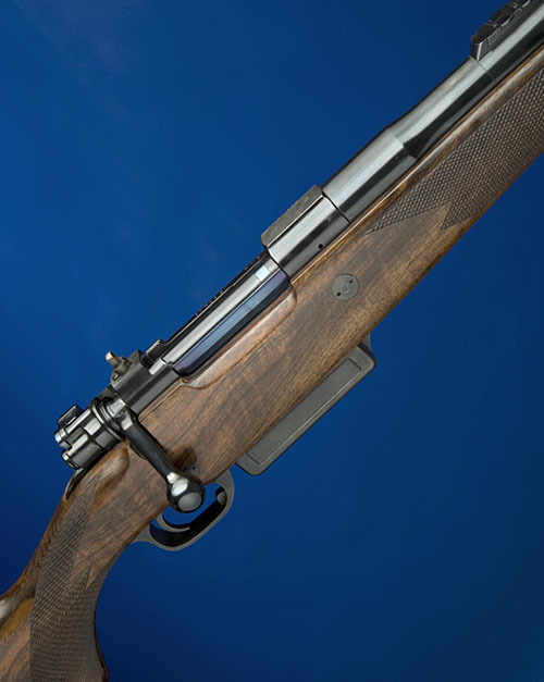61cm. blued nitro barrel, matt ramp-mounted bead fore-sight, block-mounted rear-sight of three folding leaves, blued double square bridge receiver, the rear bridge fitted with a standing aperture sight, cocking-piece with flag safety, 14 3/4in. figured pistolgrip stock including 3/4in. rubber recoil-pad, chequered grip and fore-end, blued extended magazine, blued pistolgrip-cap engraved with the initials 'JT', blued sling mounts.