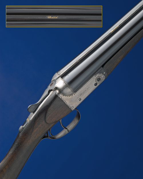 30in. nitro barrels, rib engraved 'LONDON SPORTING PARK LTD. HENDON & 60. NEW BOND STREET. LONDON.' the model designation inlaid in gold, 2 1/2in. chambers, bored approx. 1/4 and 3/4 choke, treble-grip action, automatic safety with gold-inlaid 'SAFE' detail, removable striker discs, border engraving and signed 'THE "WATTS" GUN', brushed and blued finish overall, 14 3/4in. stock including 5/8in. wooden extension, weight 6lb. 10oz.