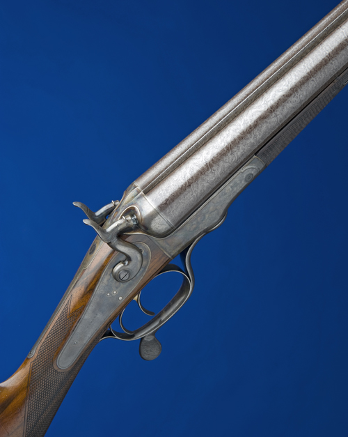 32 5/8in. nitro reproved damascus barrels, rib engraved 'J. PURDEY. 314 1/2 OXFORD STREET. LONDON.', Jones patent rotary-underlever, carved percussion fences, non-rebounding floating locks, border engraving, retaining some colour-hardened finish, 14 5/8in. figured stock including 2in. wooden extension (inked to match) and horn buttplate, weight 11lb. 14oz. The makers have kindly confirmed that this gun was completed in 1871 for the Earl of Guildford.