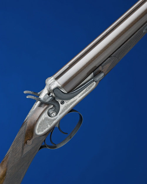 30in. nitro reproved damascus barrels (in 2009), rib engraved 'JOSEPH NEEDHAM. PATENTEE. 26. PICCADILLY. LONDON.', 2 3/4in. chambers, bored approx. true cyl. choke in both, action incorporating Needham patent rotating single bolt sidelever patent, patent no. 1544 of 1862, use number 731, the fences with external cams half-cocking the hammers as the sidelever is pushed down, slim fences and side bolsters, non-rebounding sidelocks with high-spurred hare's-ear hammers, permanently attached fore-end, best border and fine acanthus scroll engraving, brushed bright and reblued finish overall, 14 1/8in. highly-figured stock including steel buttplate, weight 6lb. 14oz.