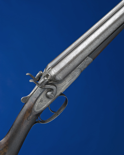 30in. black powder only damascus barrels, rib engraved 'STEPHEN GRANT. 67A ST. JAMES'S STREET. LONDON.', and '2', some pitting and dents, 2 1/2in. chambers, bored approx. true cyl. choke in both, carved percussion fences, rebounding sidelocks, fine acanthus scroll engraving, retaining traces of original colour-hardening, 14 1/4in. well-figured stock (cracked at head) with engraved heel and toe plates, missing plug, weight 6lb. 13oz. The makers have kindly confirmed that this shotgun was completed in 1880 for a Capt. Cuninghame