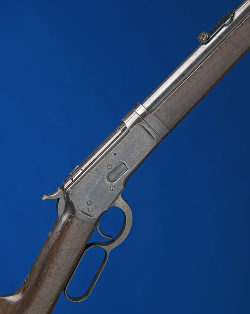 24 1/4in. blued nitro barrel, bead fore-sight, rear-sight with two small folding leaves, blued full length tubular magazine, blued action, 13in. walnut stock (some bruising), and retaining some faded original blued finish throughout.