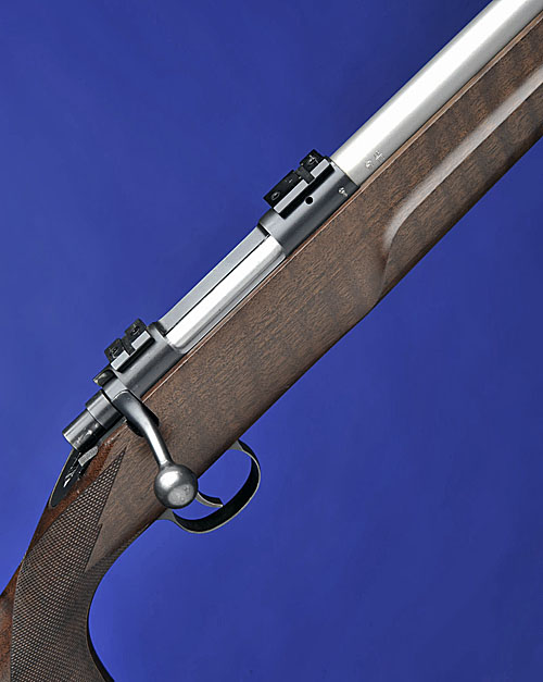 24in. nitro stainless barrel signed 'COOPER FIREARMS OF MONTANA, INC., STEVENSVILLE, MT USA' and threaded for a sound moderator, blacked receiver marked 'COOPER ARMS MODEL 21' and fitted with bases for telescopic sight rings (rings not present), 13 3/4in. figured pistolgrip stock with chequered grip and fore-end, sling eyes.