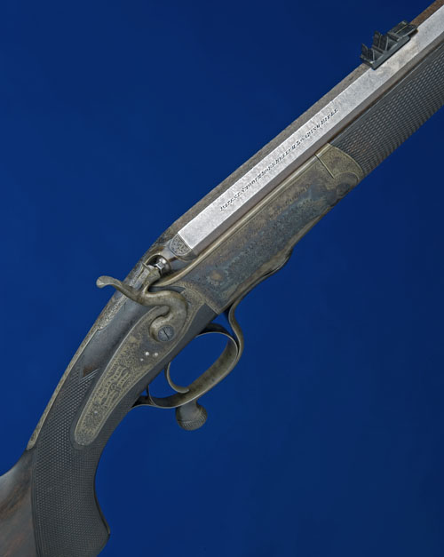 30in. black powder only octagonal barrel with folding leaf sights for 100, 200 and 300 yards and bead foresight, engraved 'CHARLES LANCASTER. 151. NEW BOND STREET. LONDON. PATENT SMOOTH BORE BREECH LOADING RIFLE.', Jones patent rotary-underlever, carved percussion fence, rebounding back-action lock with dolphin hammer, border and bold acanthus scroll engraving, the lockplate engraved 'LANCASTER. LONDON. PATENT.' in a cartouche, retaining virtually full renewed colour-hardened finish, 14 1/4in. well-figured pistolgrip stock with cheekpiece, horn pistolgrip-cap, sling-eyes and chequered steel buttplate, repair at toe, weight 7lb. 9oz.