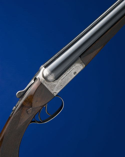 28in. nitro barrels, tubes engraved 'WEBLEY & SCOTT LTD. BIRMINGHAM.', 2 3/4in. chambers, bored approx. imp. cyl. and 1/2 choke, automatic safety, border and scroll engraved action, brushed finish, 14 3/8in. semi-pistolgrip stock (with drop points), weight 6lb. 8oz.