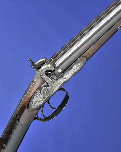 mid-19th century, with 28in. rebrowned twist sighted barrels signed 'W. PRITCHARD & SON' on the rib, scroll engraved patent breeches (nipples missing) inlaid with two gold-lines and each with platinum plug, long border and scroll engraved tang, border and scroll engraved locks each signed 'W. PRITCHARD & SON', figured walnut half-stock with chequered grip, border and scroll engraved iron mounts including trigger-plate with pineapple finial, silver barrel-bolt escutcheons, and associated ramrod with worm (one ramrod-pipe missing, the other loose, iron parts discoloured throughout), Birmingham proof marks.
