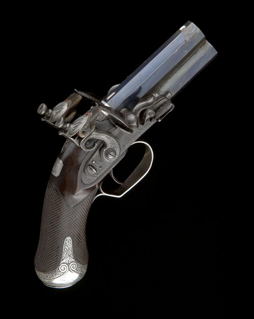 circa 1810-15, with 3in. reblued octagonal barrels each with platinum-inlaid line and platinum-lined makers stamp 'TATHAM & EGG' at the breech, the upper barrel with silver fore-sight, platinum-lined touch-holes, iron tang finely engraved with foliage and a small trophy and inlaid with a platinum line and incorporating the rear-sight, border and foliate engraved flat bevelled bolted locks each signed 'TATHAM & EGG' and with stepped-tail, French cock, gold-lined rainproof pan and roller, figured walnut stock with chequered butt (repaired beneath left lock), silver spurred pommel engraved with borders of running foliage and two martial trophies, the pommel-cap engraved with the coat of arms and motto of General Sir James Willoughby-Gordon, silver trigger-guard engraved with foliate borders and a large trophy of arms surmounted by a crown, silver escutcheon engraved with the crest of Sir James Willoughby-Gordon, and original iron ramrod with hatched tip, some scattered patches of minor surface corrosion), silver maker's mark 'MB' for Moses Brent.