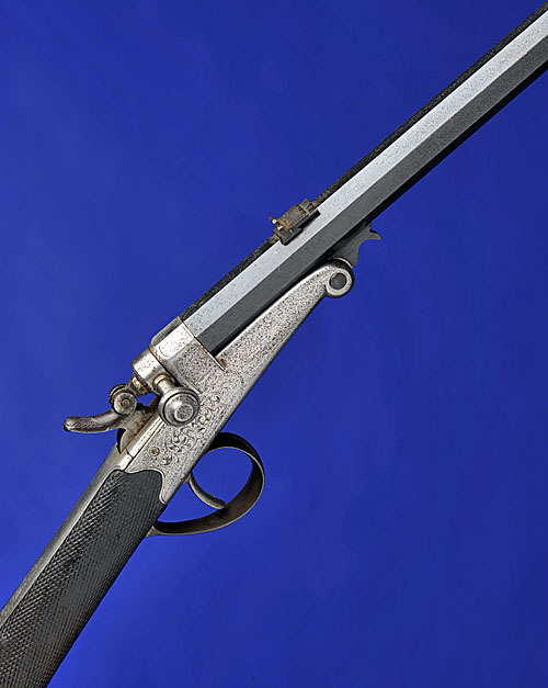 A BELGIAN .360 (NEEDLEFIRE) SCREW-BREECH HAMMER ROOK RIFLE, serial no. 2104,