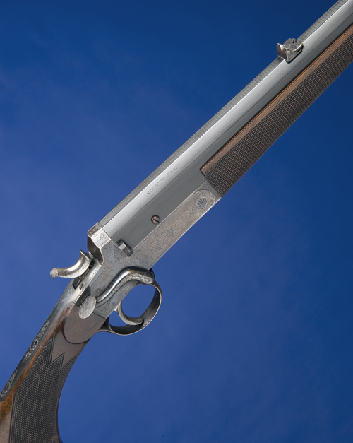 26in. reblued octagonal sight reproved nitro barrel with matt sighting flat and signed 'ALEX. MARTIN / GLASGOW & ABERDEEN', bead fore-sight, rear-sight of one standing and two folding leaves calibrated to 150 yards, border and scroll engraved action retaining some original blued finish, 14 1/4in. figured semi-pistolgrip stock with chequered grip and fore-end, chequered horn butt-plate, horn pistolgrip-cap and fore-end cap, silver escutcheon.