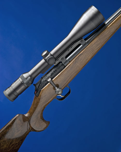 22in. blacked fluted nitro barrel with engraved ramp-mounted bead fore-sight and engraved single standing leaf rear-sight with gold-inlaid centre-line, blacked receiver carved with foliate scrollwork on a matt background, the furniture engraved en-suite, fitted with a Swarovski 'Habicht' 4-12x50 A telescopic sight in quickly-detachable mounts, 14 1/2in. highly figured un-chequered stock with 'birds-head' pistolgrip including 1/2in. rubber recoil pad, with sling eyes, set gold-washed trigger. This rifle appears to be virtually unfired.