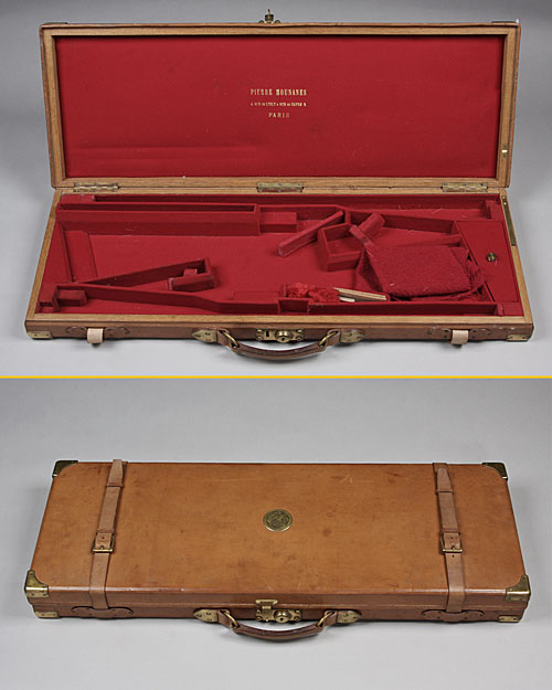 for a small-bore, fitted for 28in. barrels, red baize lined interior gold embossed 'PIERRE MOUNANES 4. RUE DE L'ISLY & RUE DU HAVRE 9. PARIS', the lid with circular brass escutcheon