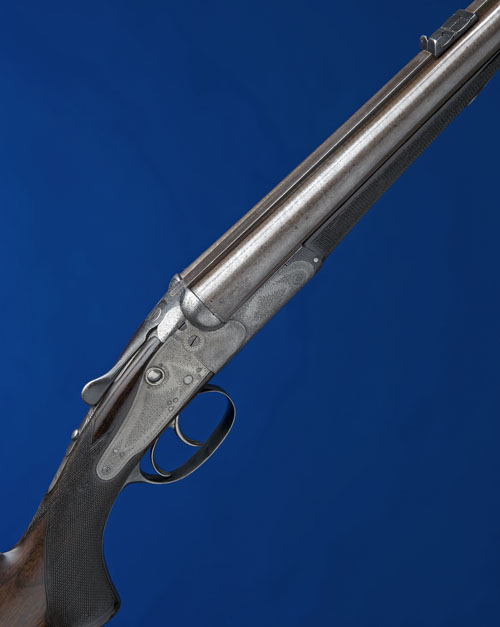 28in. black powder only damascus barrels with broad matt rib, open sights and folding leaf sights for 100, 150, 200 and 250 yards with silver-inlaid sighting lines and ramp-mounted bead foresight, tubes engraved 'W.& C. SCOTT & SON. 'TRIPLEX LEVER GRIP'. 10 GT. CASTLE STREET. REGENT CIRCUS. LONDON.', Perkes patent treble-grip barrel-cocking hammerless action, patent no. 1968 of 1878, use number 1052, with 1875 patent 'Triplex' grip, automatic safety, cocking-lever return studs, Scott patent crystal cocking-indicators, patent no. 3223 of 1875, Scott patent gas check system, patent no. 617 of 1882, use number 2650, Needham & Hinton patent intercepting sears, patent no. 706 of 1879, dipped-edge lockplates with border and fine scroll engraving, 14 1/2in. figured pistolgrip stock with cheekpiece, sling eyes, horn pistolgrip-cap and buttplate, fore-end with grip-catch release lever, weight 8lb. 13oz.