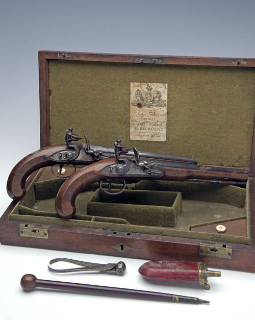 circa 1785, with 9in. blued swamped barrels each with signed 'J. PROBIN' on the full length sighting flat and engraved with a band of beadwork at the breech, brass fore-sights, rear-sights (working additions), tangs each engraved with borderlines, foliage and a band of beadwork, border engraved flat bevelled detented bolted locks each signed 'J. PROBIN' and with stepped-tail and roller, set triggers, figured walnut full stocks each with flat-sided butt, engraved iron mounts including blued trigger-guards each with acorn finial, silver escutcheons each engraved with the initials 'CP', and horn-tipped ramrods, one with worm (blued finish later, some patches of corrosion to the barrels), Tower private proof marks, in original fitted mahogany case lined in green baize with accessories including brass-mounted red leather covered pistol-flask with ball-trap and iron pincer-type bullet-mould, the lid with later trade label of John Probin & Co. for circa 1829-34, the exterior with large shaped brass escutcheon with flush-fitting carrying-handle.