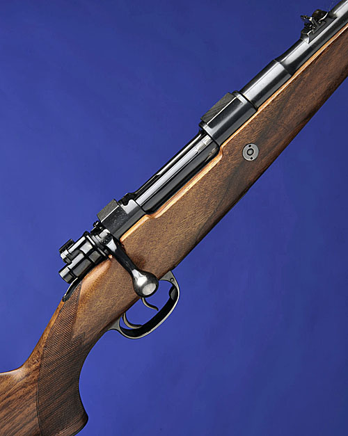 23 3/4in. blued barrel, matt ramp-mounted bead fore-sight with tunnel-cover, block-mounted rear-sight of one standing and tow folding leaves calibrated to 300 metres, blued standard size receiver marked 'MAUSER-WERKE A.G. OBERNDORF A/N' on the solid side-wall, 14 1/4in. figured pistolgrip stock including 5/8in. rubber recoil-pad, raised cheek-piece, chequered grip, schnabel fore-end, set triggers, sling mounts.