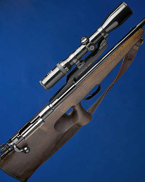 23 1/2in. blacked nitro barrel, blacked receiver, fitted with a Schmidt & Bender 4-12x telescopic sight in Apel quick detachable mounts, 14in. thumb-hole pistolgrip stock, raised cheek-piece, leather sling.
