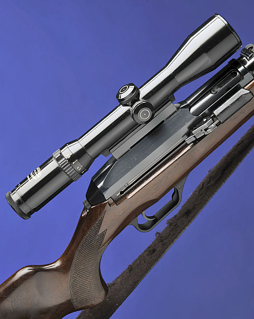 17in. nitro barrel with open sights, the receiver mounted with a Schmidt & Bender 1 1/2-6x telescopic sight, blued finish, 14in. hogsback pistolgrip stock
