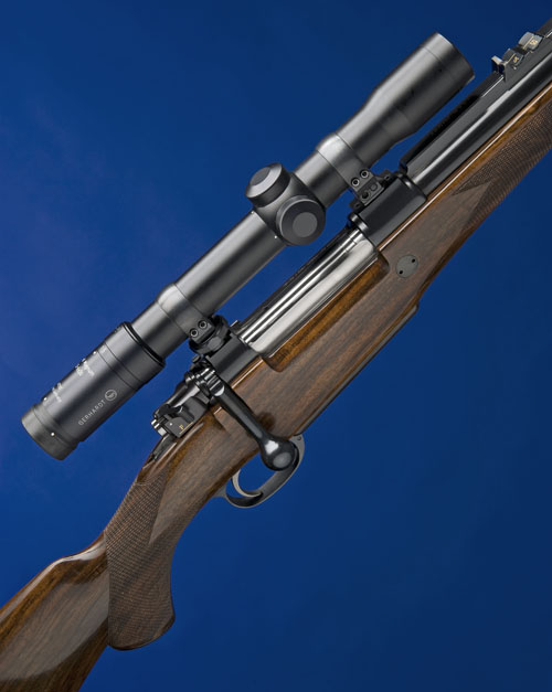 23 1/2in. blued nitro barrel with ramp-mounted bead fore-sight with flip-up cover, the barrel gold-inlaid 'JOHANNSEN', sighting flat gold-inlaid '.416 RIGBY', with rear-sight of one standing and two folding leaves with gold-inlaid centre lines and calibrated to 150 metres, fitted with a Gerhardt Nickel Magnum 1,5-6x30 telescopic sight in quick detachable mounts, blued receiver, 14 1/4in. figured pistolgrip stock chequered at the grip and fore-end with raised cheekpiece including 1/2in. rubber recoil pad, with dark fore-end cap, blued pistolgrip cap, sling swivels.