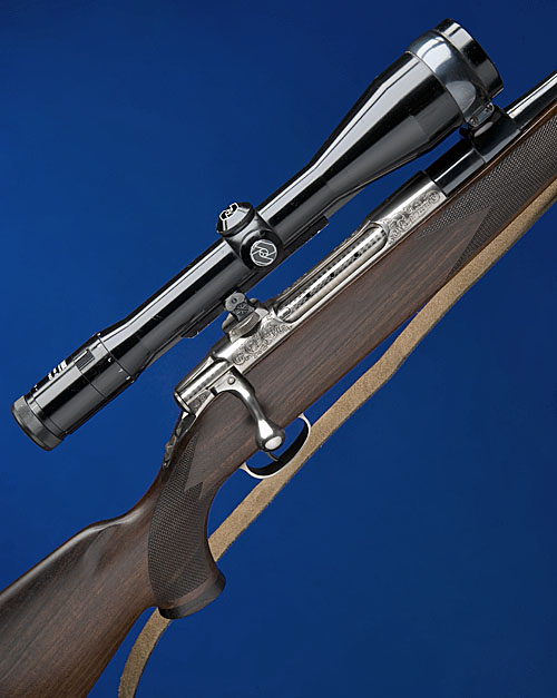 23 3/4in. blued nitro barrel with ramp-mounted blade fore-sight, rear-sight of one standing leaf, fitted with a Zeiss 'Diavari-Z' 2,5...10x52 telescopic sight in quick detachable mounts, bright receiver with stylised acanthus scroll engraving, the magazine floorplate and triggerguard engraved en-suite, 14 1/4in. pistolgrip stock including 1in. ventilated rubber recoil pad, with set trigger, leather sling.