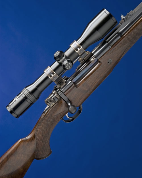 24 1/2in. blued nitro barrel engraved 'J. RIGBY & CO. LONDON, ENGLAND', with ramp-mounted bead fore-sight with tunnel cover, matt sighting flat with rear-sight of one standing and one folding leaf, blued receiver ring engraved with the calibre designation on a banner surrounded by scrollwork, fitted with a Zeiss Diavari-Z 1,5-6x42 telescopic sight in case-hardened quick-detachable side mounts, the case-hardened scope rings engraved 'RIGBY & CO. LONDON' and numbered to the rifle, case-hardened cocking piece, 14 1/2in. figured pistolgrip stock including 1/2in. rubber recoil pad, chequered at the grip and fore-end, magazine floorplate gold-inlaid with the calibre designation, steel case-hardened pistolgrip cap with hinged trap, sling swivels.