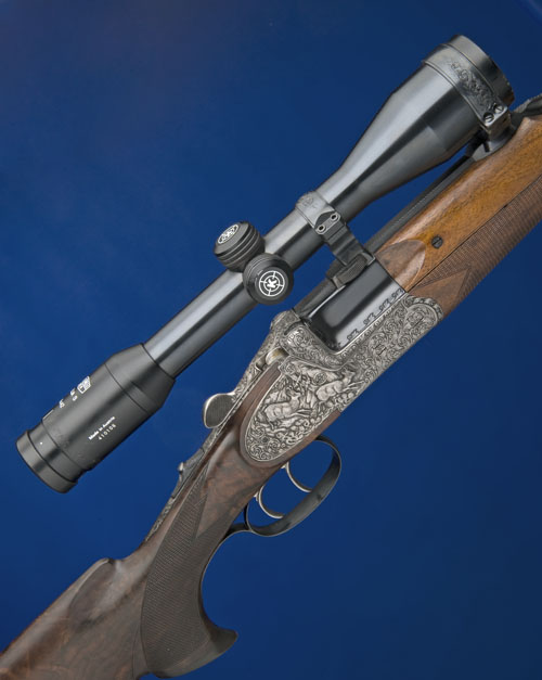 25 5/8in. nitro barrels with wooden side-fillets, matt rib with raised sight rib, open sights and ramp-mounted bead foresight, the breech end mounted with a Karl Kahles Helia S 6x42 telescopic sight in scroll-engraved quickly-detachable mounts, quadruple-grip action with side-bolsters, manual safety with integral barrel selector switch, removable striker discs, set triggers, action, decorative lockplates and furniture deeply carved in relief with stylised acanthus on a matt background, the lockplates with scenes of red deer and chamois, the underside with a roe buck, old silver finish overall, 14 3/8in. well-figured pistolgrip stock with sculpted cheekpiece, hogsback comb, sling swivels, horn pistolgrip-cap and including 1/2in. rubber recoil pad, weight 8lb. 11oz.