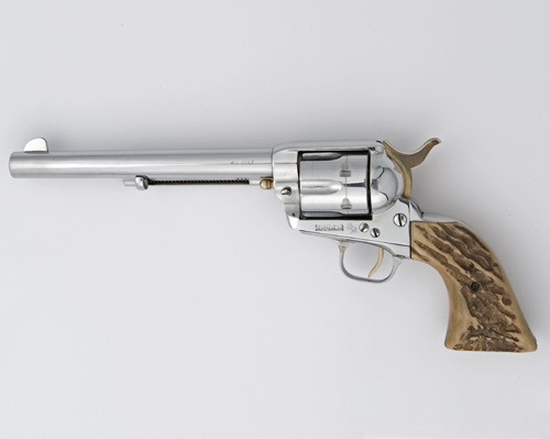 7 1/2in. barrel, gold-washed hammer, trigger and cylinder-pin, polished natural staghorn grips, and retaining virtually all its nickel-plated finish (slight wear to gold-washed finish), in a modern factory carton.