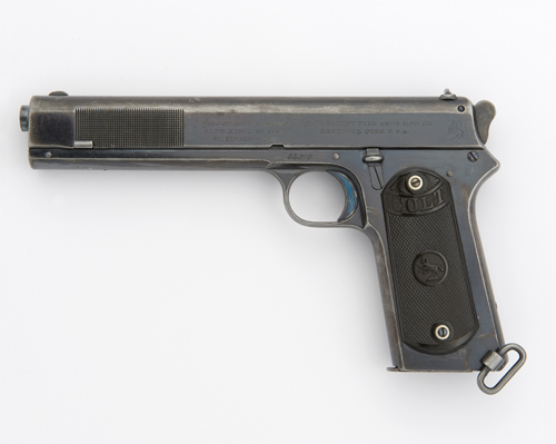 6in. blued barrel, blued slide and frame, slide with chequered panel to the front, chequered hard rubber grips with rampant colt and marked 'COLT', case-hardened hammer, lanyard loop, and retaining much original blued finish throughout.