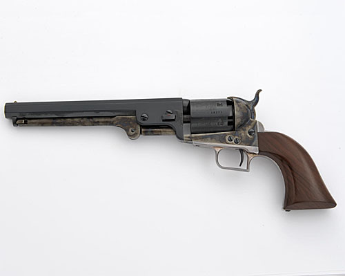 7 1/2in. blued octagonal barrel, blued cylinder with roll engraved naval engagement scene, case-hardened frame, hammer and rammer, nickel-plated grip-strap and trigger-guard, blued trigger, figured walnut grips, in as new condition.