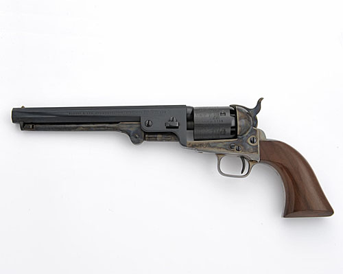 7 1/2in. blued octagonal barrel marked 'ROBERT E. LEE COMMEMORATIVE - NINETEEN SEVENTY ONE', blued cylinder with naval engagement scene, case-hardened frame, hammer and rammer, blued trigger, nickel-plated grip-strap and trigger-guard, one-piece walnut grips, in as new condition, in original lined and fitted case with accessories including 'Dixon Flask'.