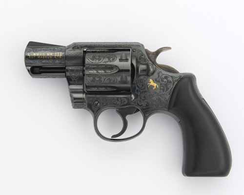 2 1/4in. blued barrel with gold-inlaid 'LAWMAN MK III / 357 MAGNUM CTG.' on the left side and engraved with scrollwork against a stippled ground on the barrel, ejector-rod housing and muzzle, blued cylinder engraved with scrollwork and foliage all against a stippled ground, blued frame engraved with further scrollwork, waved lines and panels of chequering and with a gold-inlaid rampant colt on the left side with the engravers initials 'A.A.W.', plain hardwood grips, the top of the grip-strap with the gold-inlaid initials 'BB' (for Bernd Bittner), case-hardened hammer, blued trigger, in as new condition, in close-fitted chamois-lined wooden case with glazed lid.