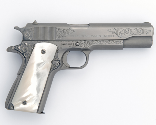 A .45 (A.C.P.) 'MKIV SERIES '70 GOVERNMENT MODEL' STAINLESS SELF-LOADING PISTOL, serial no. 70G36078 for 1973, 5in. barrel, the slide and frame engraved with sprays of scrollwork all against a stippled ground, the spur either side of the grip-safety engraved with the initials 'BB', mother of pearl grips, grade A engraving.