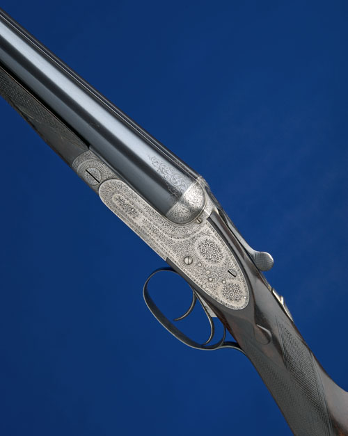 28in. replacement nitro barrels (by another, rib spuriously signed), 2 3/4in. chambers, bored approx. 1/4 and 3/4 choke, automatic safety with gold-inlaid 'SAFE' detail, patent gas checks, gold-inlaid cocking-indicators, best fine bouquet and scroll engraving, retaining very slight traces of original colour-hardening, 14 1/4in. boldly-figured stock, weight 6lb. 7oz. The makers have kindly confirmed that this shotgun was built for a Mr. Buxton and completed 1892.