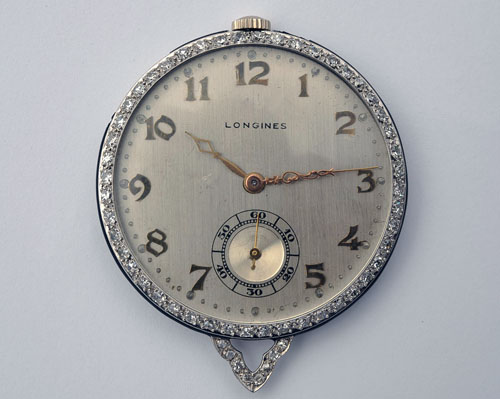 signed Longines, movement signed Longines 17 jewels serial no. 3556729, bezel set with approximately 46 diamonds, fob link at 6 set with 8 diamonds, domed crown at 12, gold applied arabic numerals and hands, seconds sub-dial at 6, brushed white metal face and plain platinum back, enamel band (some damage) around perimeter of case.