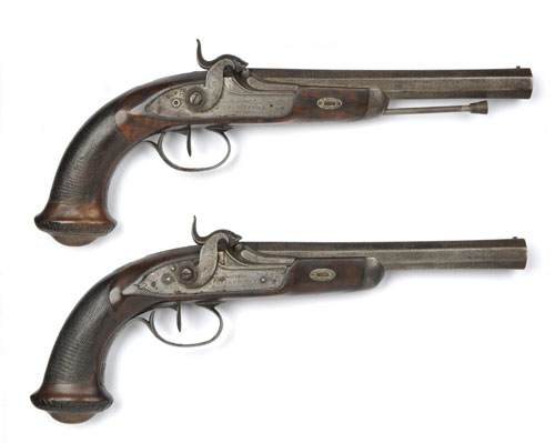 circa 1835, with 8 5/8in. swamped twist sighted barrels, border engraved tangs each incorporating a rear-sight, border engraved flat locks with feint signatures, figured walnut half-stocks each with chequered butt (minor chips and cracks), engraved iron mounts, iron ramrod (one ramrod missing, iron parts with some wear and surface pitting throughout), St. Etienne proof.