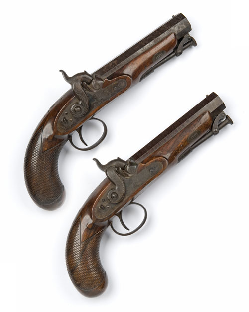 circa 1840, with 4 3/4in. browned twist sighted barrels each signed 'WILSON LONDON' towards the breech, border and scroll engraved breeches, scroll engraved tangs each incorporating a rear-sight, border and scroll engraved bolted locks each signed 'WILSON' and retaining traces of original faded case-hardening, figured walnut three-quarter stocks each with chequered butt (both rubbed opposite the locks), iron mounts including scroll engraved trigger-guards each retaining traces of original blued finish, iron stirrup ramrods (some areas of surface corrosion throughout).