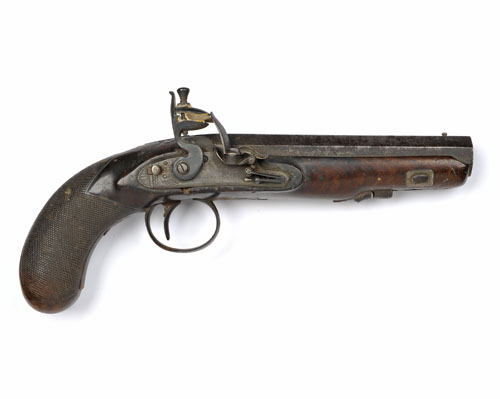 A 14-BORE FLINTLOCK TRAVELLING PISTOL SIGNED BUSBY & FOX, LONDON,