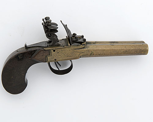 A BRASS CONTINENTAL DOUBLE-BARRELLED FLINTLOCK BOXLOCK COACH PISTOL,
