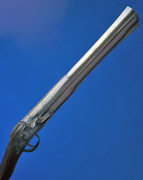 brass two-stage barrel with belled muzzle, marked 'LONDON' and scroll engraved toward the tang and stamped with a makers mark (tang screw missing), border engraved lock (broken cock, metalwork discoloured), missing sideplate, walnut stock with iron mounts (woodwork in poor condition), London proof marks