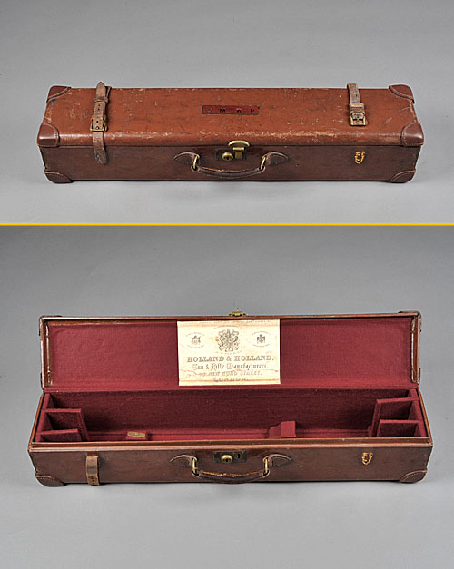 to accept 30in. barrels, the interior re-lined with burgundy baize and applied Holland & Holland trade label, reinforced leather corners, one strap detached.