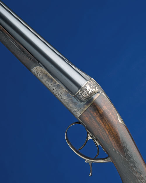 27 1/2in. (70cm) nitro barrels with sunken rib, 2 3/4in. chambers, bored approx. 1/4 and full choke, treble-grip action with rising third bite, underlever operation, carved leaf fences with sprung loaded indicators, the triggers with ambidextrous sliding bar safety, bold scroll engraving, retaining some original colour-hardening and finish, 15 3/8in. well-figured semi-pistolgrip stock with retracting sling, including 1 3/8in. ebonite extension, ejectors require attention, weight 7lb. 2oz., in a canvas and leather case